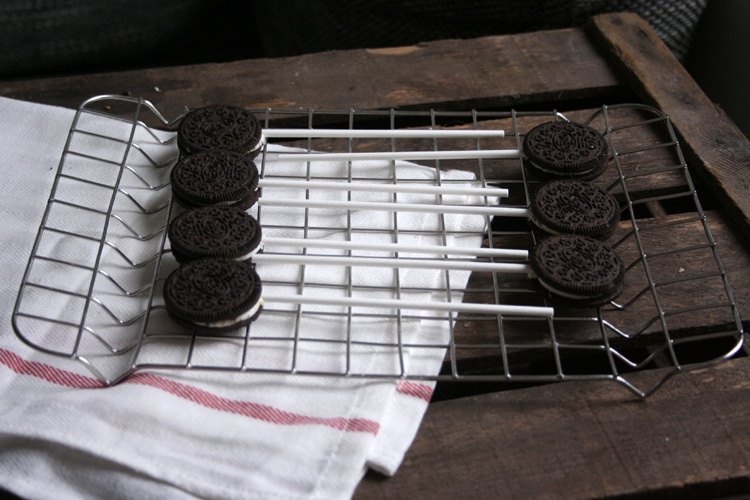 • Nun die weiße Kuvertüre schmelzen. Jeweils auf eine Oreohälfte einen Klecks Kuvertüre geben, den Lollistick drauf und abschließend mit der zweiten Oreohälfte verschließen. Gut festwerden lassen.