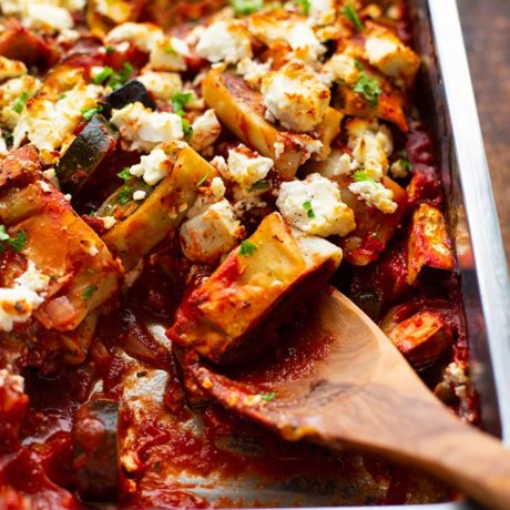 Wir sprechen hier von dickem, würzigem Ratatouille vollgepackt mit einer Wagenladung Sommergemüse und passierten Tomaten. Dazu gibt’s herzhafte Veggie-Maultaschen und knusprige, goldbraune Fetastückchen. Das Beste: Für dieses Rezept müsst ihr nur die Zutaten schnibbeln und alles nach und nach in den Ofen hauen.