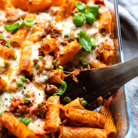 Ich pimpe Rigatoni al Forno gerne mit Erbsen aus dem TK. Dadurch bekommt der italienische Klassiker im Handumdrehen einen Gemüse-Kick.