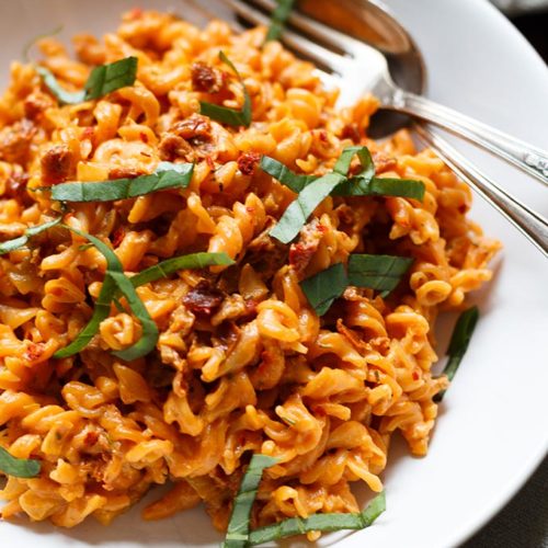 Rote Linsen Pasta mit cremigster Getrocknete Tomaten-Sauce