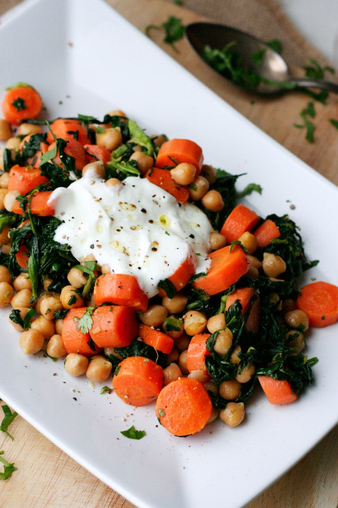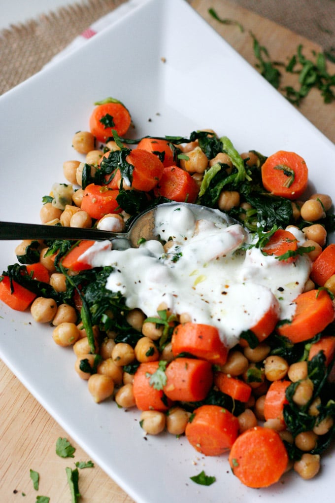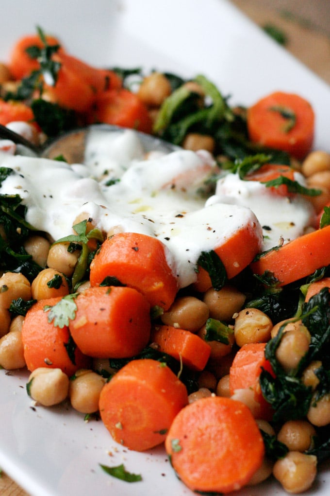 Die schnelle Kichererbsenpfanne mit Joghurt ist gesundes Comfort Food wie aus 1001 Nacht. Knackige Karotten, sättigende Kichererbsen, Blattspinat und ein Klecks Joghurt, nehmen euch mit auf eine Geschmacksreise der besonderen Art.