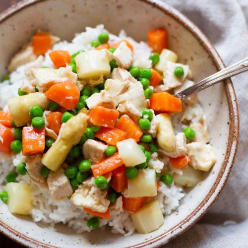 Schnelles Hühnerfrikassee angerichtet mit Reis auf einem Teller.
