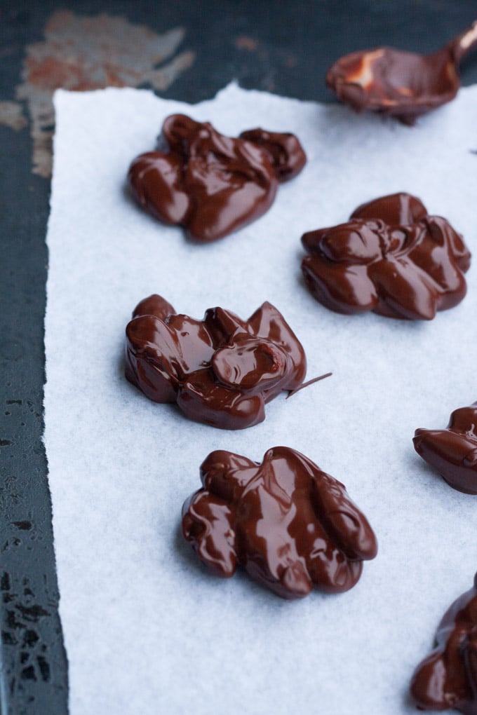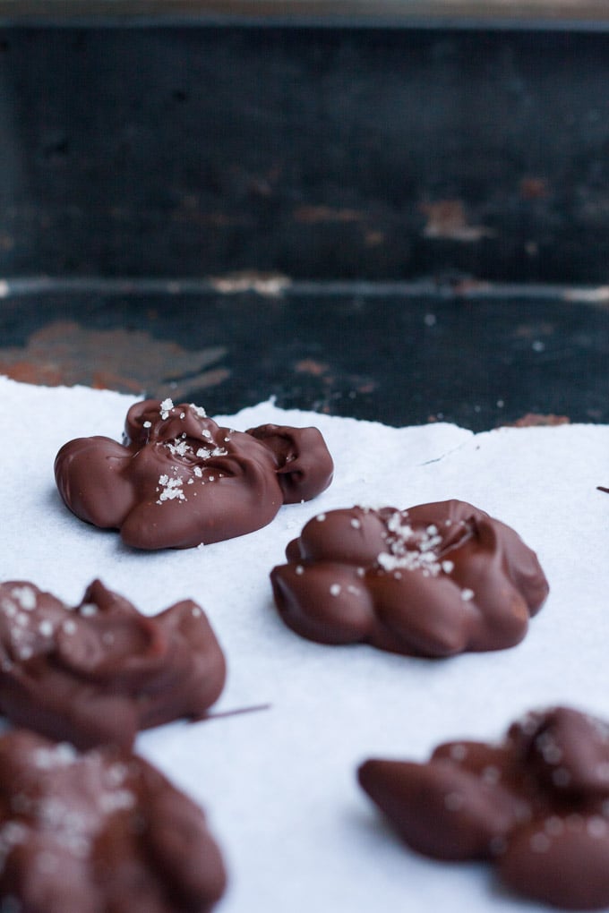 • Schoko-Mandeln mit zwei Teelöffeln auf dem Backpapier verteilen. Mit Meersalz bestreuen.