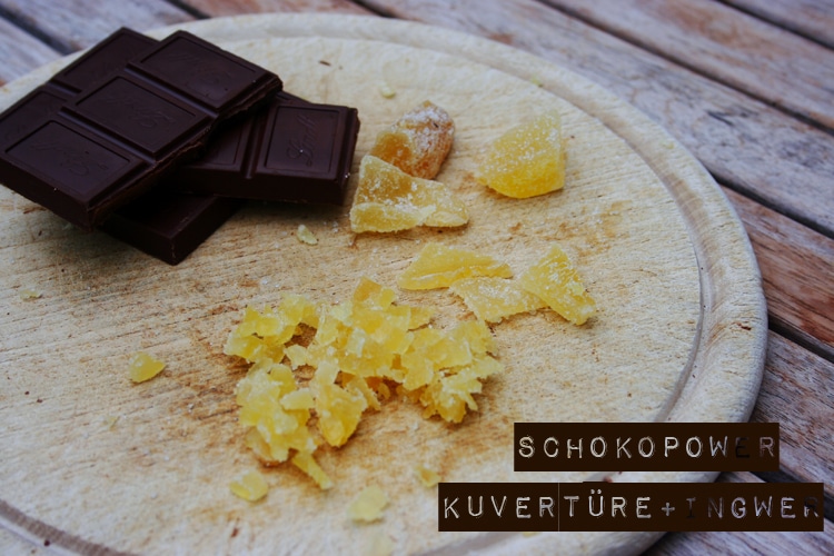 Hilfe, ich brauche doch meine Schokolade! Und was macht Frau in einer solch schier aussichtslosen Situation? Genau, selber machen natürlich! Also schnell ein Paket Zartbitterkuvertüre und eine Tüte getrockneten und kandierten Ingwer geschnappt und ab nach Hause.