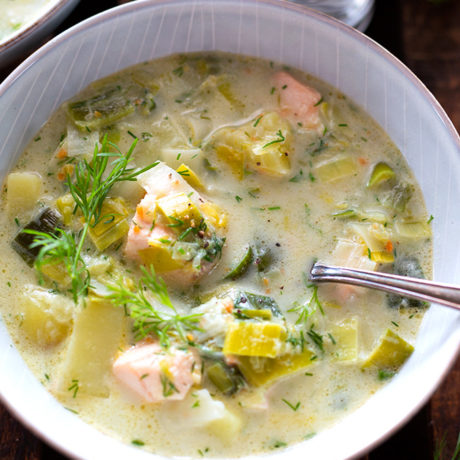 • Vollgepackt mit Kartoffeln, Lachs, Lauch, Gemüsebrühe und Sahne.