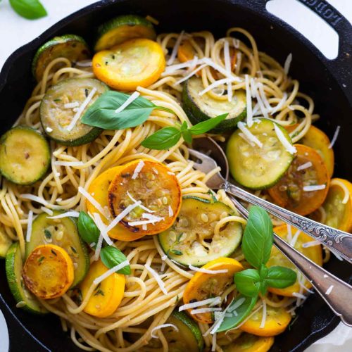 - Abgeschüttete Spaghetti zu den Zucchinischeiben geben, restliches Olivenöl darüber verteilen und alles gut vermischen. Mit Salz und Pfeffer abschmecken und mit ordentlich Parmesan servieren.