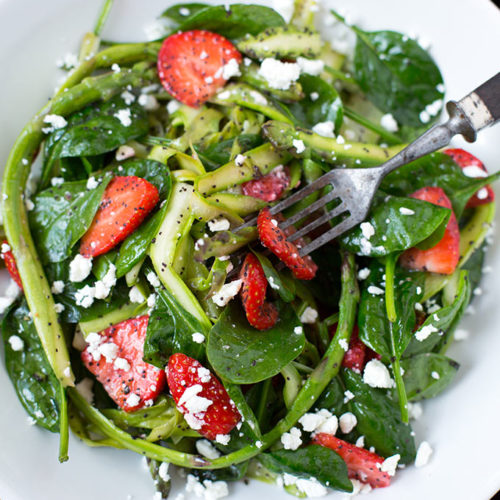 Als allererstes sage ich euch, warum ihr den Spargel-Erdbeer-Salat mit Feta unbedingt probieren müsst: