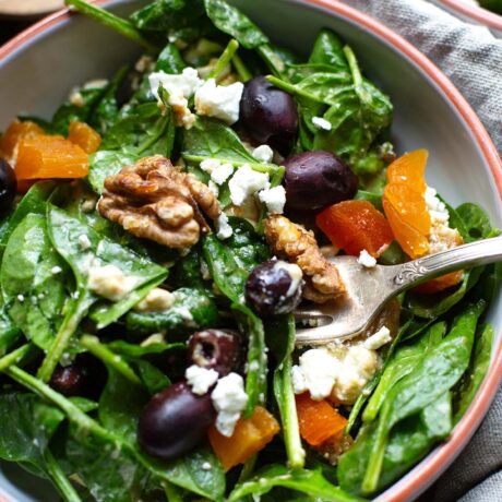 Dieser Spinatsalat mit Feta und Honig-Senf-Dressing macht süchtig! Das 15-Minuten Rezept steht in Windeseile auf dem Tisch und ist vollgepackt mit Oliven, dicken Fetakrümeln und getrockneten Aprikosen. So einfach UND lecker kann gesund sein!