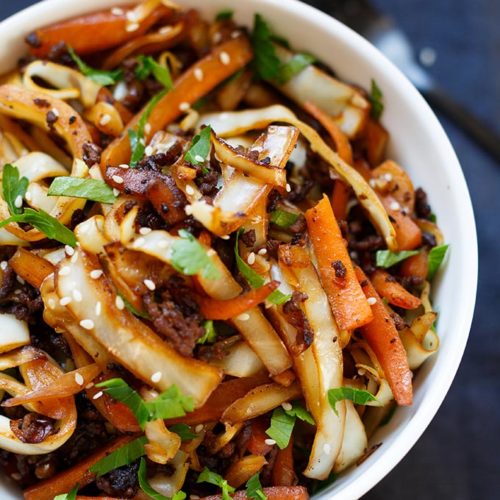 • Sobald das Hackfleisch knusprig ist, Kohl und Karotten hinzufügen. Unter Rühren 3-4 Minuten braten, dann Sauce hinzufügen und weitere 5-7 Minuten braten, bis der Kohl gar aber noch knackig ist.