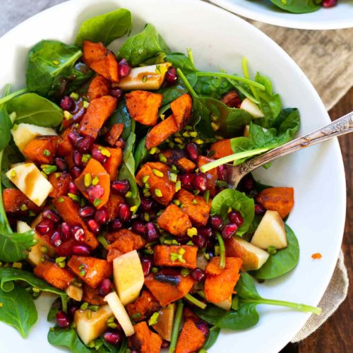 • Kurz vor dem Servieren Spinat waschen und trocken schleudern. Apfel waschen, entkernen und würfeln. Spinat auf zwei Teller verteilen, dann mit Süßkartoffelwürfeln, Apfelstücken, Granatapfelkernen und Pistazien toppen. Zum Schluss mit Honig-Senf-Dressing beträufeln und genießen.