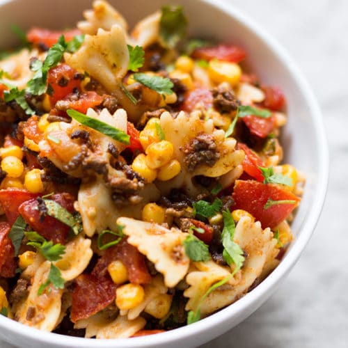 Einfacher Taco Nudelsalat mit würzigem Hackfleisch, Tomaten, Nudeln, Mais, Koriander und Taco Sauce. Super schnell gemacht und SO gut!