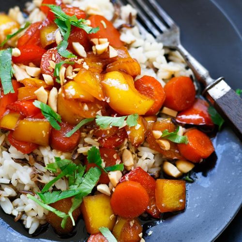 Teriyaki-Gemüse mit Reis und Erdnüssen