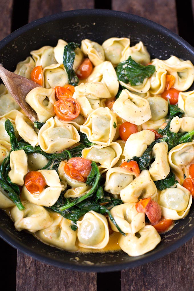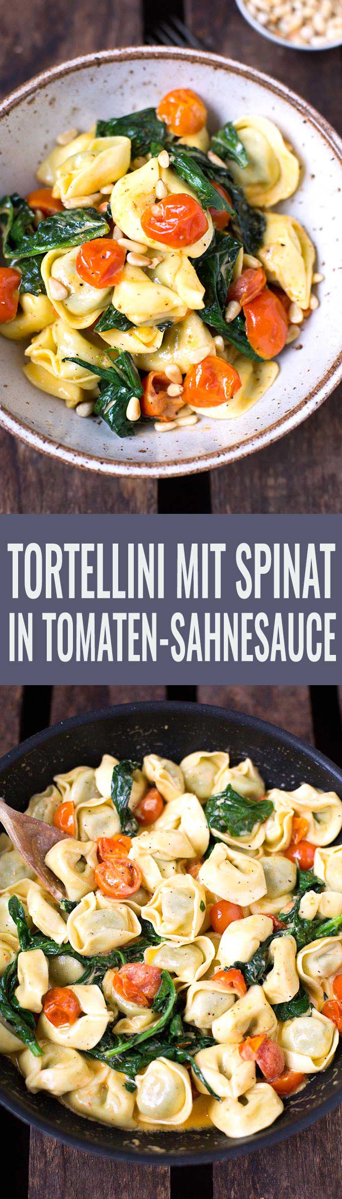 Werbung. Tortellini mit Tomaten-Sahnesauce und Spinat. Dieses 8-Zutaten Rezept ist einfach, in 20 Minuten fertig und SO gut - Kochkarussell.com