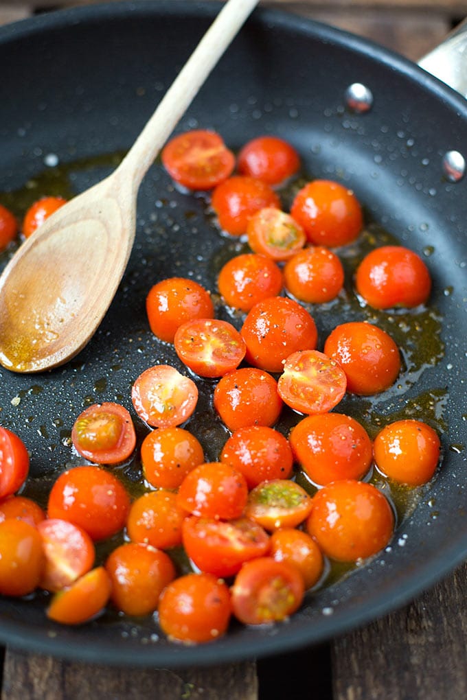 Werbung. Gebratene Tomaten für die Tortellini mit Tomaten-Sahnesauce und Spinat - Kochkarussell.com