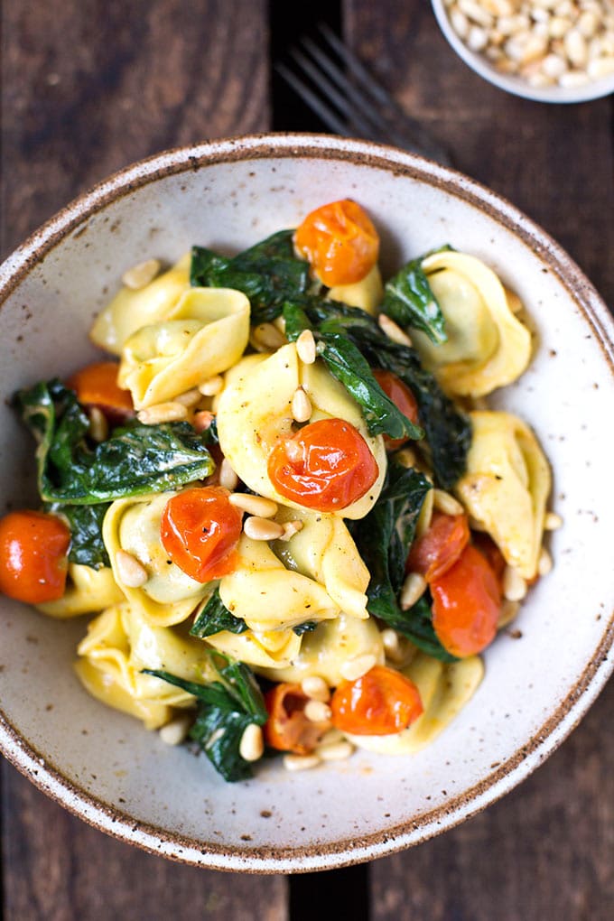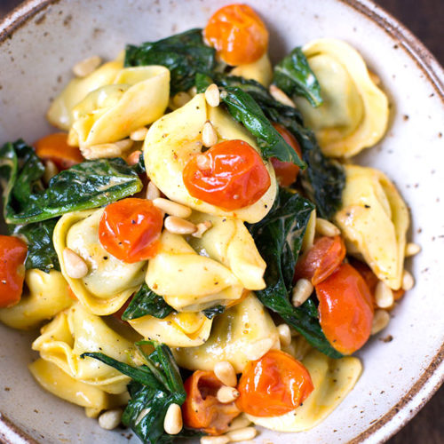 Wir reden hier von Tortellini mit Spinat-Ricotta-Füllung in einer himmlisch sahnigen Sahne, dazu in Olivenöl gebratene Tomaten und Blattspinat. Obendrauf gibt es geröstete Pinienkerne und Parmesan, fertig ist das Soulfood DELUXE.