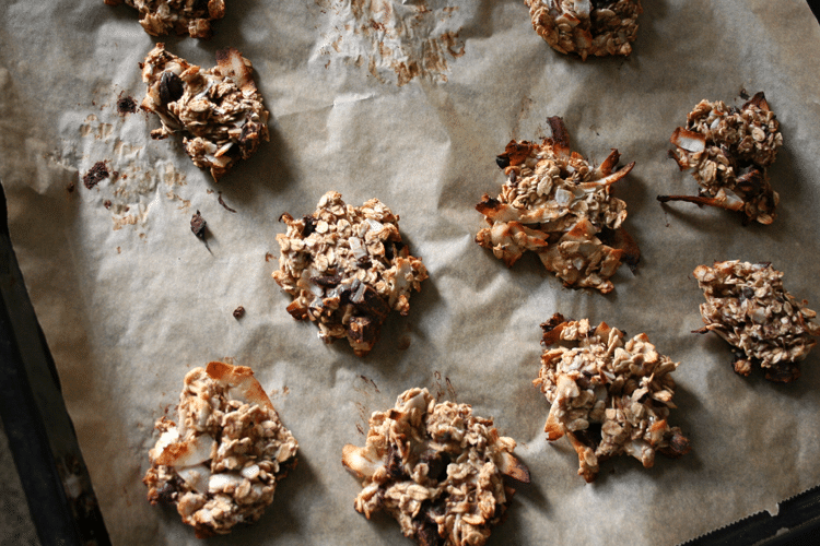 • Den "Teig" esslöffelweise auf ein mit Backpapier belegtes Backblech geben. Die Cookies für circa 13-15 Minuten bei 175 Grad backen.