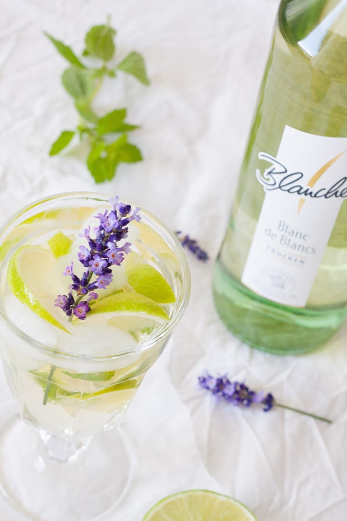 Eiswürfel in ein Glas geben. Die Limette in Scheiben oder Stücke schneiden und hinzufügen. Mit 125 ml Blanc de Blancs Trocken auffüllen und Lavendel- und Limetten-Sirup hinzufügen. Umrühren