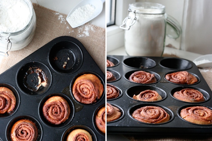 • Für circa 11-15 Minuten backen, bis die Zimtschnecken gold braun sind.