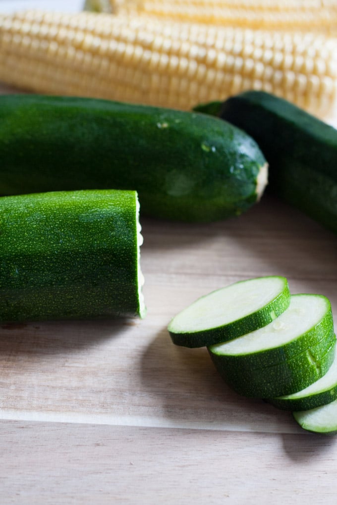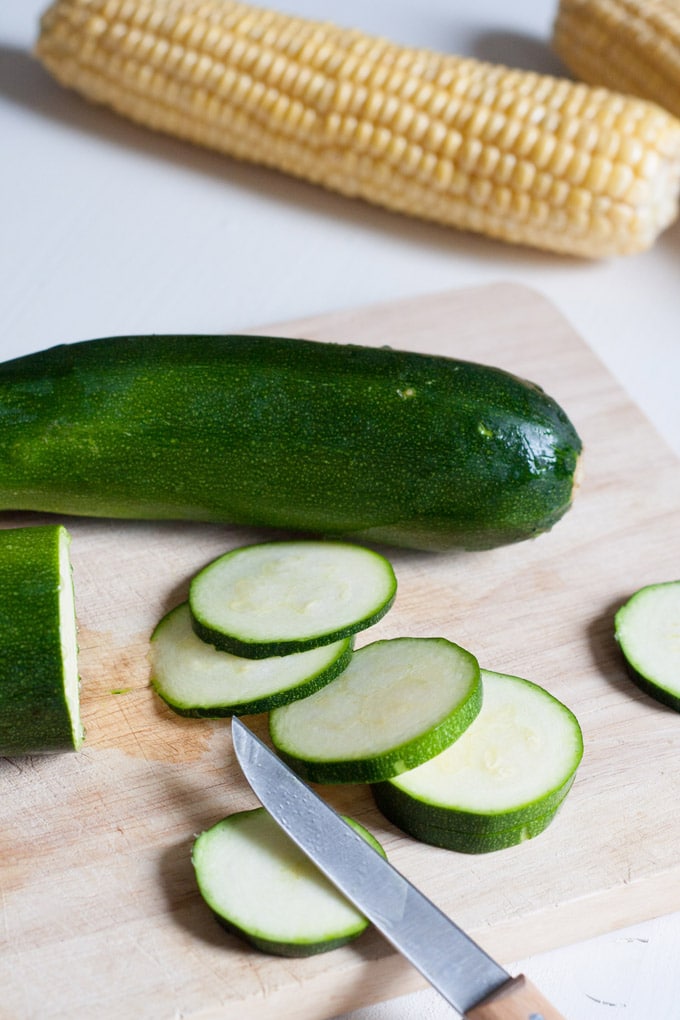 • Währenddessen Zucchini in dünne Scheiben und Maiskörner vom Kolben schneiden. In die Pfanne geben und 5 bis 10 Minuten garen. Von der Hitze nehmen.