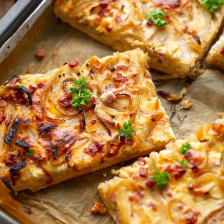 Und: Wenn es etwas gibt, das zum goldenen Herbst passt, dann ist es dieser saftige Zwiebelkuchen vom Blech. Super einfach, sättigend und durch fertigen Pizzateig perfekt für den Feierabend!